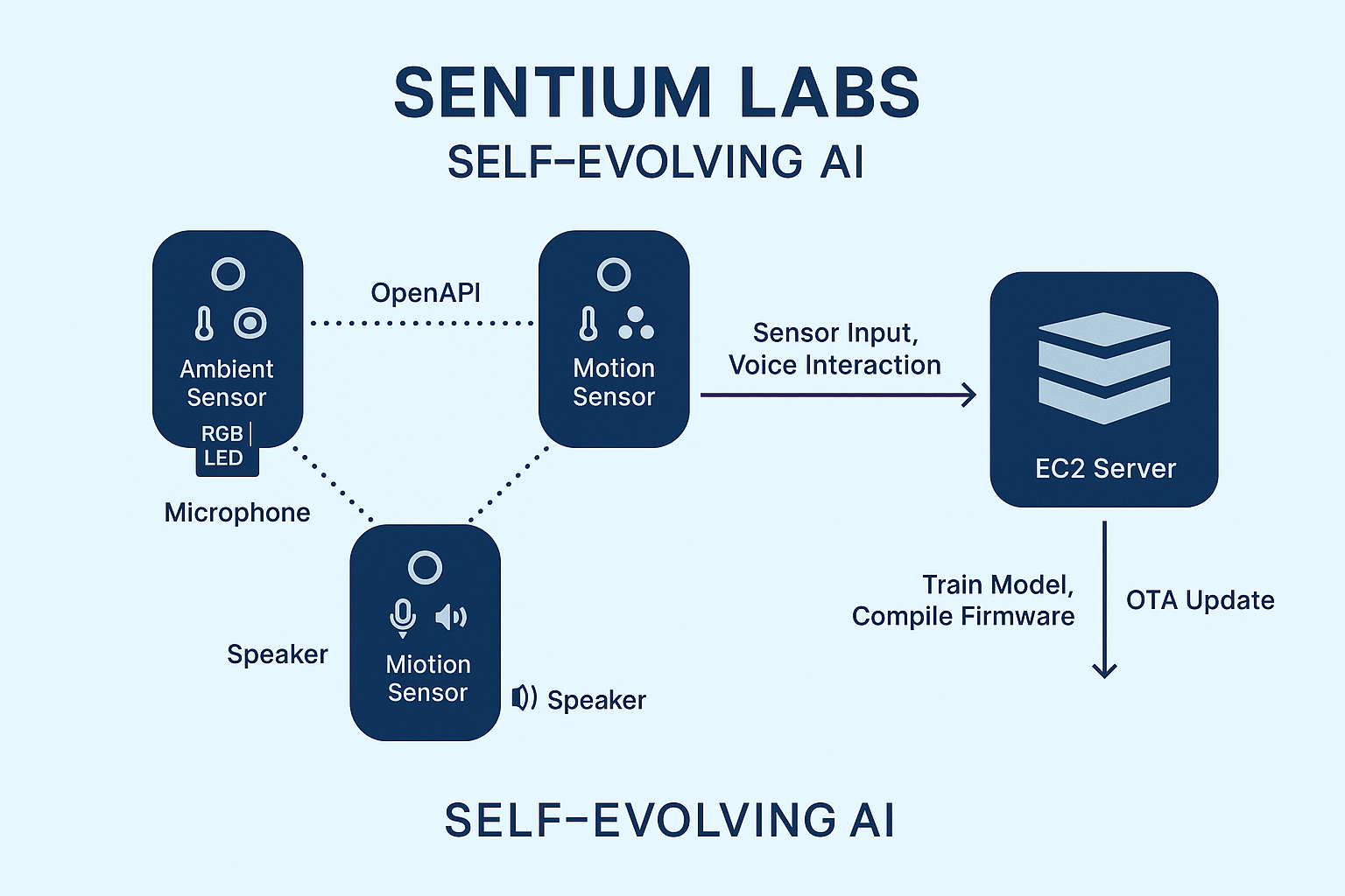 Instead of relying on fixed instructions, Sentium devices send flagged experiences to a remote EC2 server. This server acts like the brain of the system—an evolution hub.